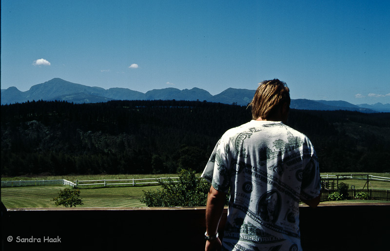 14. Tag - 11.02.1998 - Mittwoch Hurra, blauer Himmel Nach einem leckeren Frühstücksbuffet ging es an den Strand. Leider war das Wasser ziemlich kalt. Die Flut kam, wir machten Striche in den Sand und schauten zu, wie das Wasser einen nach dem anderen auslöschte. Nach 3,5 Stunden und 40 Strichen fuhren wir zurück ins Hotel und legten uns dort an den Pool. Gegen 16 Uhr gingen wir ins Zimmer und stellten fest, dass wir beide einen leichten Sonnenbrand hatten, also morgen nichts mit beachen. Blick vom Balkon Das Abendessen mit Shrimps und Thunfischsalat und die Hauptspeise Pork Fillet mit Bacon, Mushrooms und Onions war traumhaft gut An der Bar ließen wir den Abend wieder ausklingen.