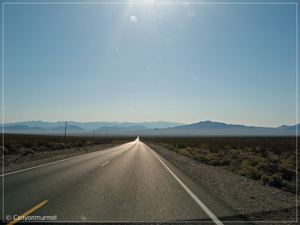 In Death Valley Junction biegen wir auf die 373 Richtung Amargoosa Valley. Dort fahren wir auf die 95 Richtung Las Vegas. Rechterhand sind noch schneebedeckte Berge zu sehen.