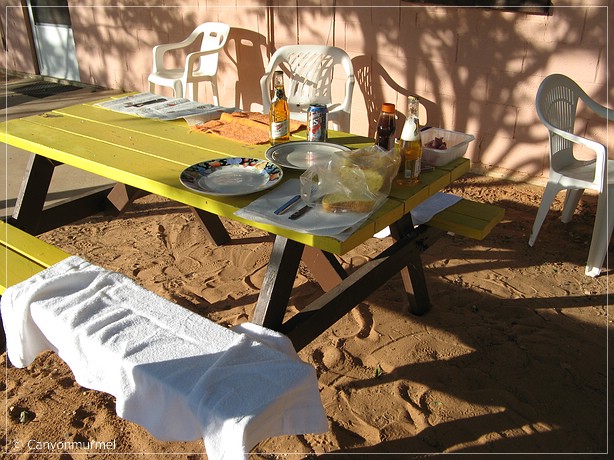 Dann fahren wir noch zum Walmart und kaufen Fleisch zum grillen bei Bob, außerdem einen Wegwerfgrill mit Kohlen. Zurück bei Bob setzen wir uns hinten raus und trinken ein kühles Bier. Dann tragen wir einen Tisch mit zwei Bänken vor unser Zimmer. Ich schreibe gemütlich im Freien den Reisebericht und Klaus zündet den Grill an.
