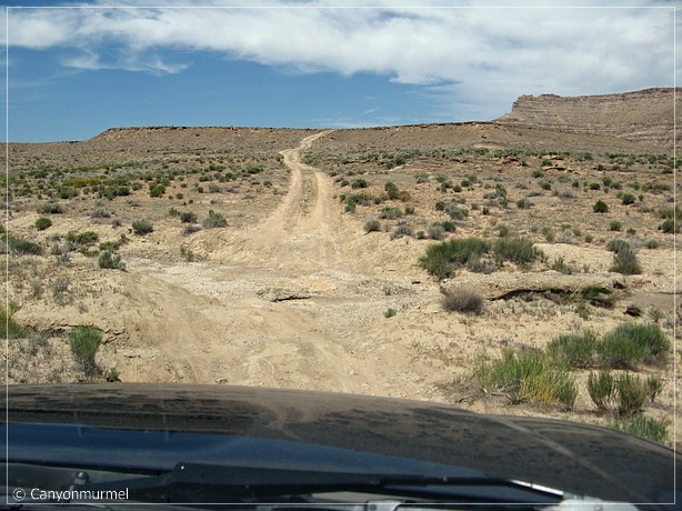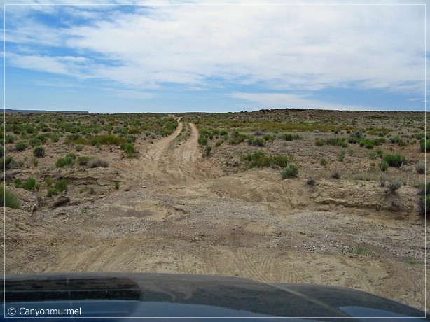 Also fahren wir zur Cottonwood Canyon Road und dort nach einer Meile wieder rechts auf die BLM 431. Dieser folgen wir für 8 Meilen bis rechts der White Sands Jeep Trail abzweigt. Nach 1,3 Meilen soll ein Zaun kommen, unser Ziel.