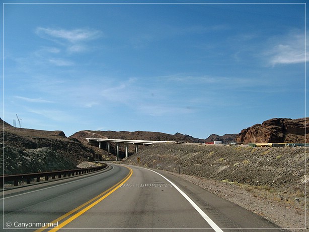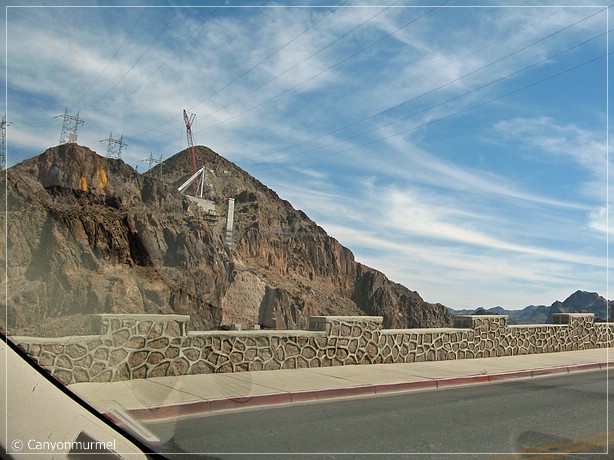 Nach einer Stunde fahren wir weiter nach Las Vegas. Bereits weit vorm Hoover Dam waren Schilder, daß Trucks, Busse und Trailer nicht mehr über den Dam fahren dürfen. Weitere Schilder weisen darauf hin, daß 9 Meilen vorm Dam eine Inspection Station ist, an der alle Fahrzeuge kontrolliert werden. Auch wird daraufhin gewiesen, daß der Bypass 2008 fertig sein soll. Man sieht deutlich, daß es mal 2007 geheißen hat, die 7 entfernt wurde und durch eine 8 ersetzt wurde. Als wir bei der Inspection Station ankommen werden wir, wie alle anderen Fahrzeuge auch, nur durchgewunken. Was für Kontrollen. Als wir uns dem Hoover Dam nähern, sieht man schon eine fertige Brücke, die wohl ein Teil der künftigen Bypass Strecke ist.