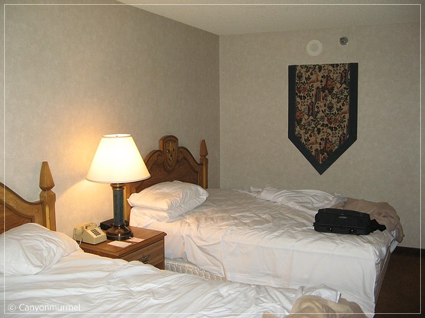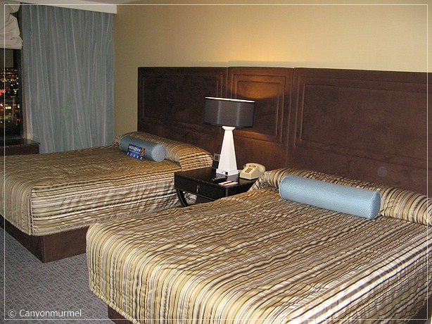 Wir marschieren los zu Tower 1, da mir am Morgen am Telefon gesagt wurde, daß unser Zimmer in Tower 1 liegt. Wir haben 12240. Also wird es wohl im 22 Stock liegen. Wir fahren rauf und es ist gleich das erste Zimmer mit der 40 am Ende. Ich stecke die Schlüsselkarte rein, aber nichts tut sich. Gibt’s doch nicht. Ein genauer Blick auf die Nummer an der Tür sagt uns, wir stehen vor Zimmer 22240. Uih, nichts wie weg. Wir fahren ins Stockwerk 12. Dort gehen wir wieder zum ersten Zimmer. Nun, auch hier paßt die Nummer nicht. Wir lesen unseren Ausdruck genauer und sehen, your room is in Tower 2. Toll! Also runter, quer durchs Casino, wieder zweimal angequatscht wegen der Show Tickets. Wir fahren ins 12. Stockwerk in Tower 2. Schlüsselkarte rein, wieder tut sich nichts. Wir vergleichen die Zimmernummer, aber diesmal sind wir richtig. Da kommt ein Mitarbeiter vorbei, wir fragen ihn um Rat. Er schaut die Schlüsselkarte an und meint, die ist zu klein und zeigt uns seine. Stimmt, unsere sind schmal, seine hat Scheckkartenformat. Oh Mann, also wieder runter, quer durchs Casino, wieder zweimal angequatscht und zur Guest Info. Wir bekommen zur Auskunft, in Tower 2 wurden alle Türschlösser ausgetauscht, aber die Check In Automaten sind noch nicht umgestellt. Wir bekommen unsere richtigen Schlüsselkarten. Hurra, also zurück. Wieder angequatscht, ich reagiere schon nicht mehr so freundlich Rauf ins Stockwerk 12 und siehe da, unsere Tür öffnet sich Es geschehen Zeichen und Wunder. Vom Zimmer aus haben wir Blick auf die Türme.