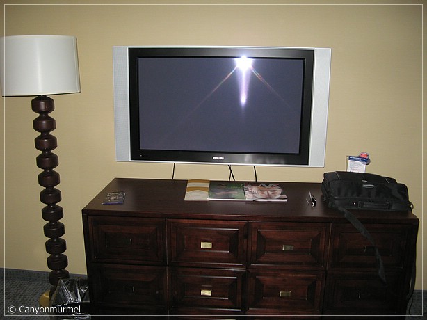 Wir nehmen unsere Schlüssel und kehren erstmal ins alte Zimmer zurück. Die Handtücher sind weg, aber gewischt wurde nicht. Wir entschließen uns, das neue Zimmer mal anzusehen. Es ist im 25. Stock, also mit dem Aufzug rauf in den 18. Stock, rüber zu den anderen Aufzügen, die die oberen Stockwerke anfahren und rauf in den 25. Stock. Das Zimmer ist ganz anders eingerichtet. Viel moderner und schöner, ein Flachbildschirmfernseher hängt an der Wand.