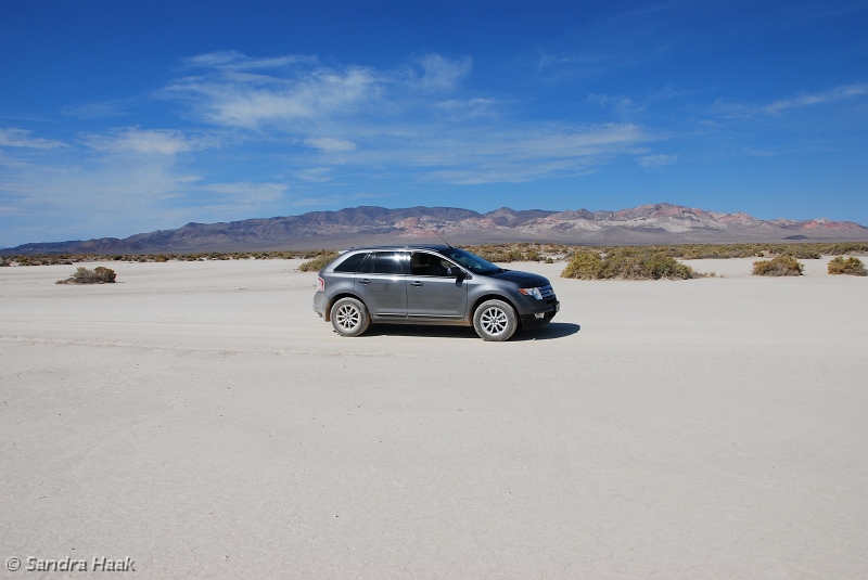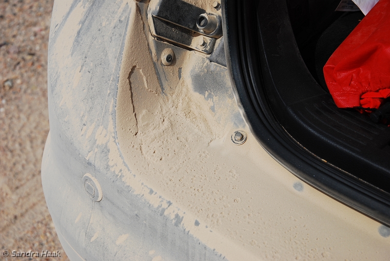 Bald kamen wir zu Sanddünen, die mußten wir offensichtlich umrunden. Das ging ganz gut, aber die Dünen hörten nicht auf. Mittlerweile war auch die Straße sandig, aber wie. Immer tiefer wurde der Sand. Und keine Möglichkeit anzuhalten. Denn dann würden wir feststecken. Also immer weiter, das ging ewig so. Klaus gab Vollgas und der Edgi grub sich durch. Wer jemals etwas gegen den Edge und seine Qualitäten vorgebracht hat, sollte dies hier sehen. Klaus meinte zwischendurch, der fährt sich genauso wie der Trailblazer. Das einzige Manko ist, daß der Edge keine Platte unterm Motorraum hat.