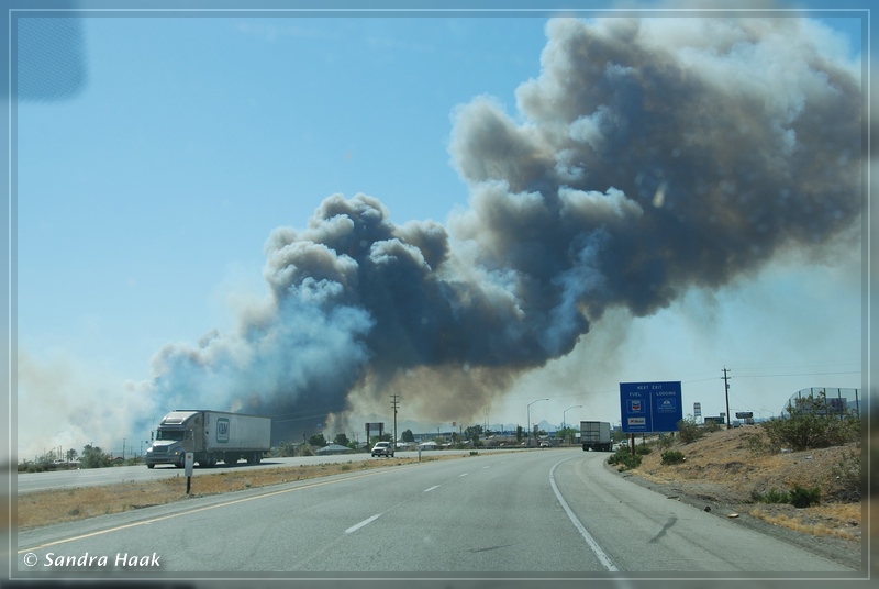 Vor lauter Schauen nach der Rauchwolke verpaßten wir die Abfahrt Richtung Highway und landeten so wieder in Needles, von wo wir das kleine Stück, bis die 95 auf den Highway trifft, wieder zurückfuhren. Hier kamen wir nun direkt am Ursprung der Rauchwolke vorbei, das ganze Gelände stand in Flammen