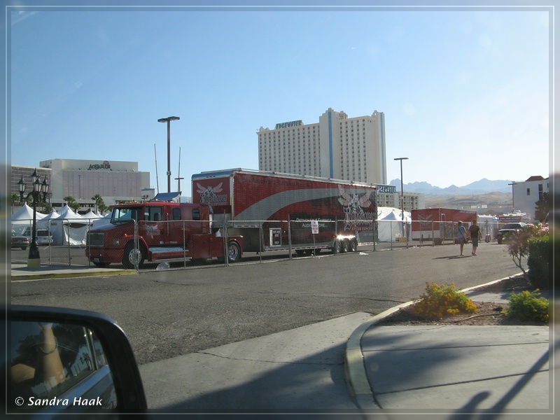Während wir den Casino-Drive in Laughlin entlang fuhren, sahen wir, daß der Aufbau für den Laughlin River Run schon in vollem Gange war. Ich knipste ein paar Bildchen aus dem Auto raus.