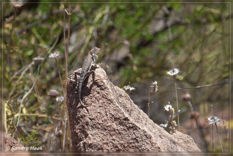 Entweder man marschierte den schmalen Weg runter oder man hatte ein ATV. Da wir weder Lust hatten bei dieser Hitze irgendwohin zu marschieren, noch ein ATV hatten, begnügten wir uns mit einem Foto von oben und sahen uns noch ein wenig um. Überall blühte es hier, sogar ein paar Saguaro-Blüten gab es schon zu sehen.