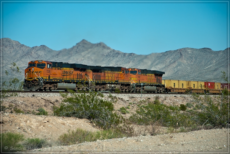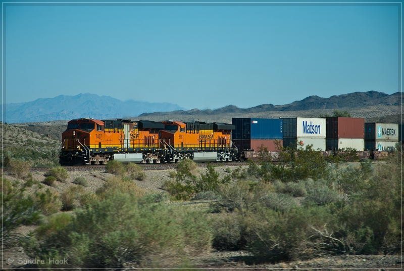 Die Ivanpah Road ist wirklich eine langweilige Strecke Endlich erreichten wir Goffs und fuhren ein Stück auf der alten Route 66, wo uns zwei Züge passierten.