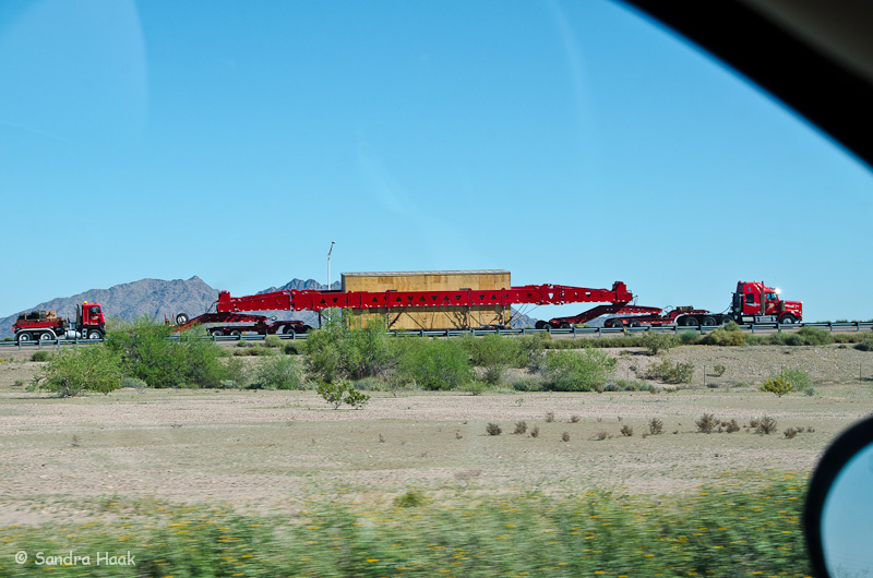 Kurz nach der Border Patrol ging es plötzlich nur noch im Kriechtempo voran. Ein riesiger Schwertransporter, der so breit war, wie der gesamte Highway war vor uns. Was für ein Glück, dass wir bei Gila Bend vom Highway runter mussten.