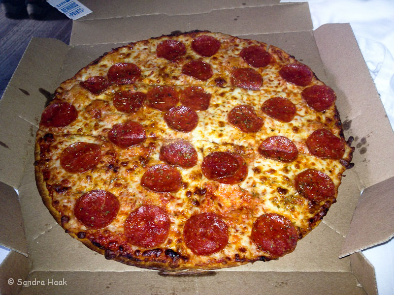 Später fuhren wir schräg gegenüber zu Dominos und holten uns zwei medium thincrust Pepperoni Pizza.